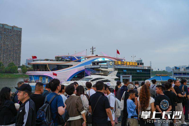 长沙晚报掌上长沙10月4日讯(全媒体记者 邹麟)这个国庆中秋假期,长沙天气宜人,湘江夜游成了游客心头的“香饽饽”。4日傍晚,记者在三馆一厅旅游码头看到,前来乘坐游轮的游客早已排起了长队,江风裹挟着秋日的清爽拂面而来,两岸灯火璀璨,将粼粼波光染成流动的星河,连掠过耳畔的晚风,都化作最温柔的同行者,游客们纷纷拿起手机记录这美好的时刻。
